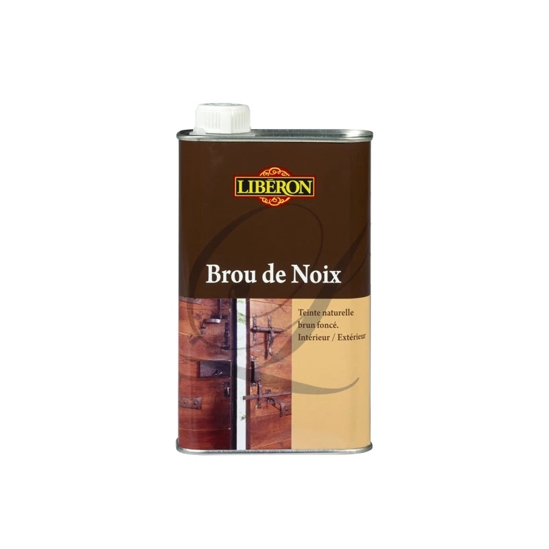 Brou de noix LibĂ©ron. IdĂ©al pour masquer les dĂ©fauts des bois anciens. Donne aux bois blancs l’aspect du noyer. RĂ©sistance Ă la lumiĂšre. Sans odeur gĂȘnante. Rendement : 0.5L = 8mÂČ