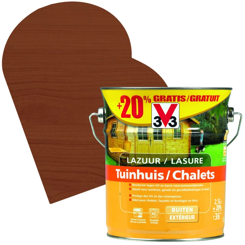 La lasure Chalets de la marque V33 se présente comme la solution incontournable pour embellir vos abris de jardin en bois. Applicable sur tous types de bois, ce produit vous offre une protection optimale face aux intempéries et aux rayons UV tout en lui apportant une seconde jeunesse grâce à une jolie finition couleur chêne foncé Cet élément a l’avantage de pouvoir être appliqué par un pistolet de peinture pour une mise en couleur plus facile et rapide.