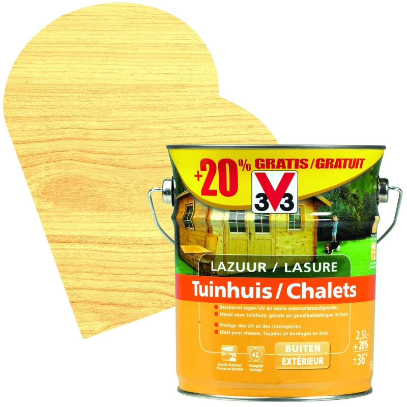 La lasure Chalets de la marque V33 se présente comme la solution incontournable pour embellir vos abris de jardin en bois. Applicable sur tous types de bois, ce produit vous offre une protection optimale face aux intempéries et aux rayons UV tout en lui apportant une seconde jeunesse grâce à une jolie finition incolore. Cet élément a l’avantage de pouvoir être appliqué par un pistolet de peinture pour une mise en couleur plus facile et rapide.