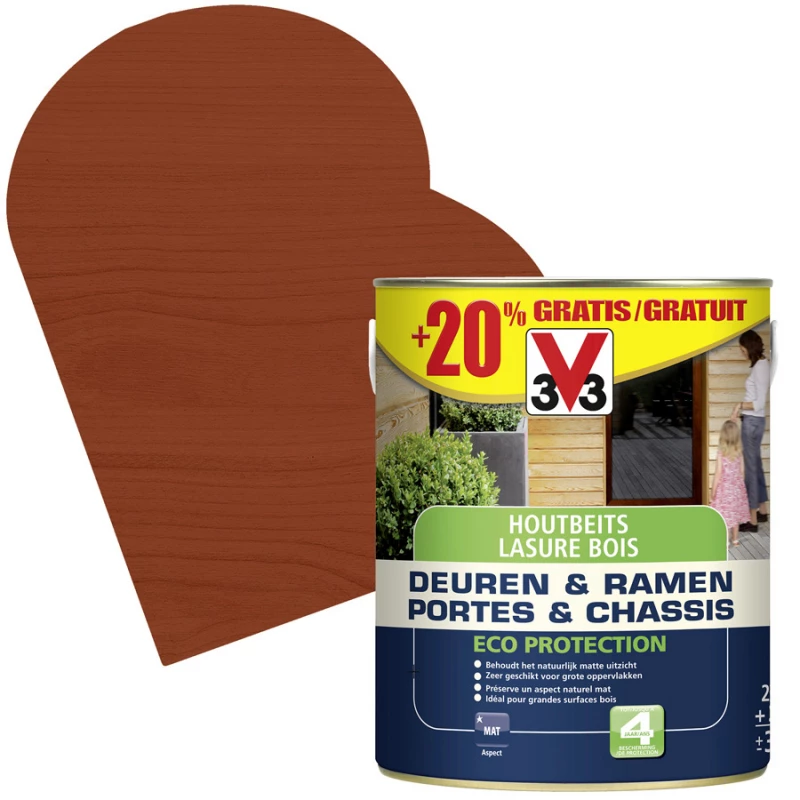 La lasure Eco Protection la marque V33 s’applique sur les bois extérieurs, neufs ou anciens. Elle est spécialement conçue pour les portes, les châssis, les façades, les pignons, ainsi que les grandes surfaces en bois.