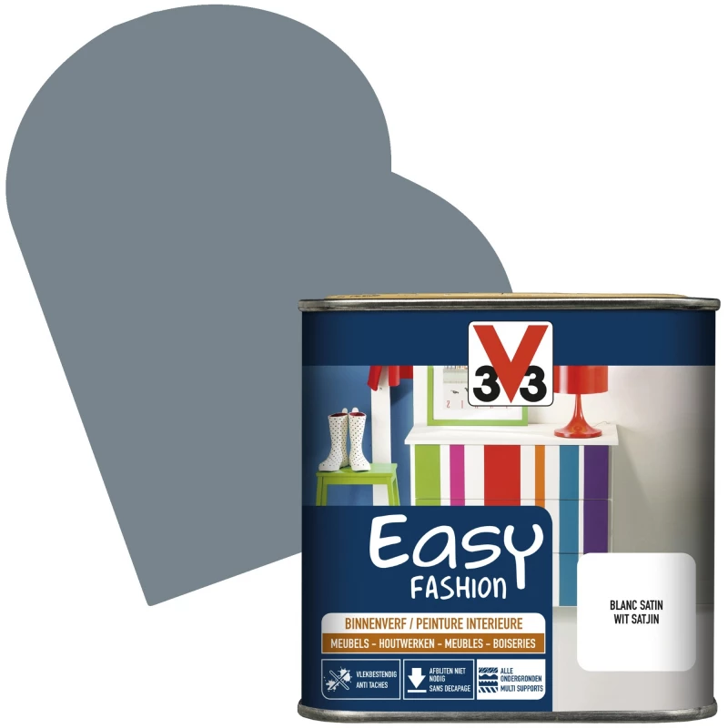 Si vous cherchez une solution efficace pour donner une nouvelle jeunesse à votre intérieur, la peinture Easy Fashion de la marque V33 convient idéalement. Ce produit vous permet d’appliquer une jolie couleur bleu orage à la finition satinée afin de rénover vos meubles, neufs ou anciens. Applicable sur tous types de supports, cet élément vous offre une résistance optimale et durable face à l’eau, les taches ou les chocs. Vous pouvez utiliser ce produit sans décapage du support au préalable.