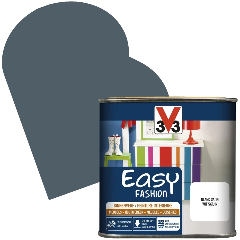 Si vous cherchez une solution efficace pour donner une nouvelle jeunesse à votre intérieur, la peinture Easy Fashion de la marque V33 convient idéalement. Ce produit vous permet d’appliquer une jolie couleur bleu pétrole à la finition satinée afin de rénover vos meubles, neufs ou anciens. Applicable sur tous types de supports, cet élément vous offre une résistance optimale et durable face à l’eau, les taches ou les chocs. Vous pouvez utiliser ce produit sans décapage du support au préalable.