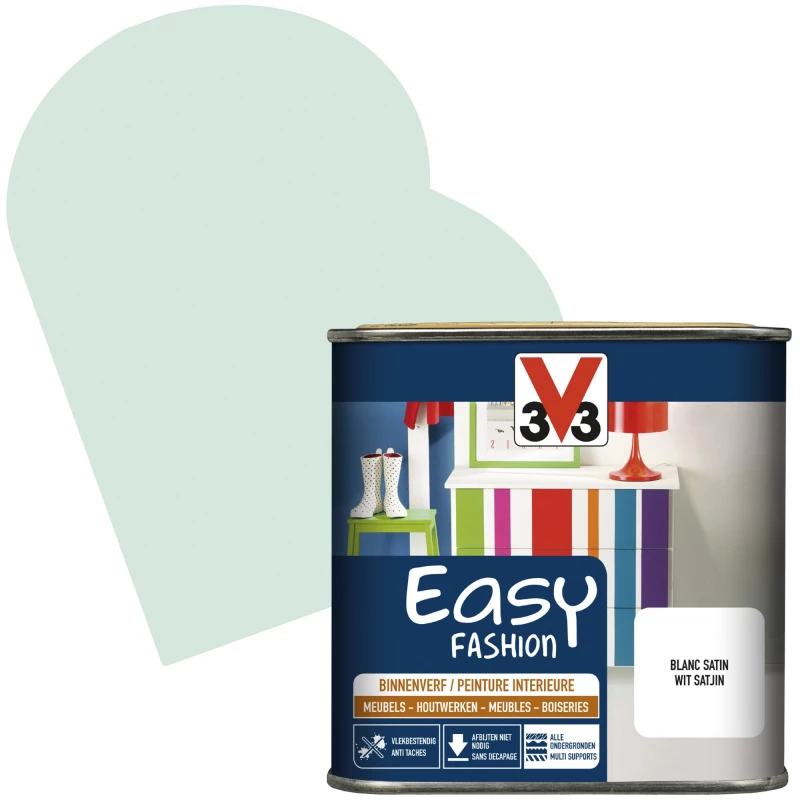 Si vous cherchez une solution efficace pour donner une nouvelle jeunesse à votre intérieur, la peinture Easy Fashion de la marque V33 convient idéalement. Ce produit vous permet d’appliquer une jolie couleur menthol à la finition satinée afin de rénover vos meubles, neufs ou anciens. Applicable sur tous types de supports, cet élément vous offre une résistance optimale et durable face à l’eau, les taches ou les chocs. Vous pouvez utiliser ce produit sans décapage du support au préalable.