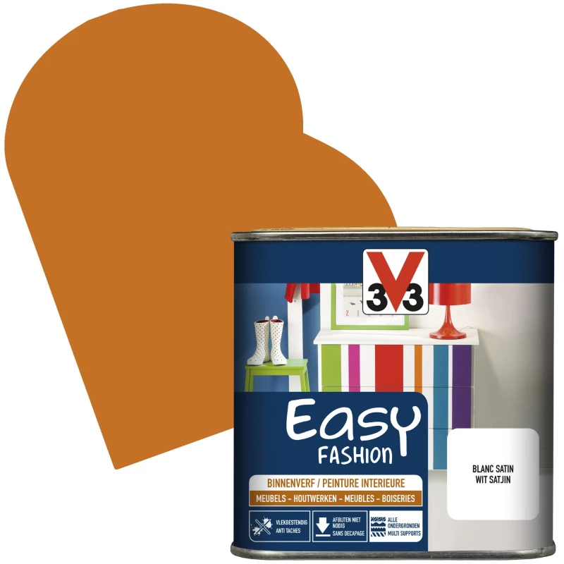 Si vous cherchez une solution efficace pour donner une nouvelle jeunesse à votre intérieur, la peinture Easy Fashion de la marque V33 convient idéalement. Ce produit vous permet d’appliquer une jolie couleur orange sixties à la finition satinée afin de rénover vos meubles, neufs ou anciens. Applicable sur tous types de supports, cet élément vous offre une résistance optimale et durable face à l’eau, les taches ou les chocs. Vous pouvez utiliser ce produit sans décapage du support au préalable.