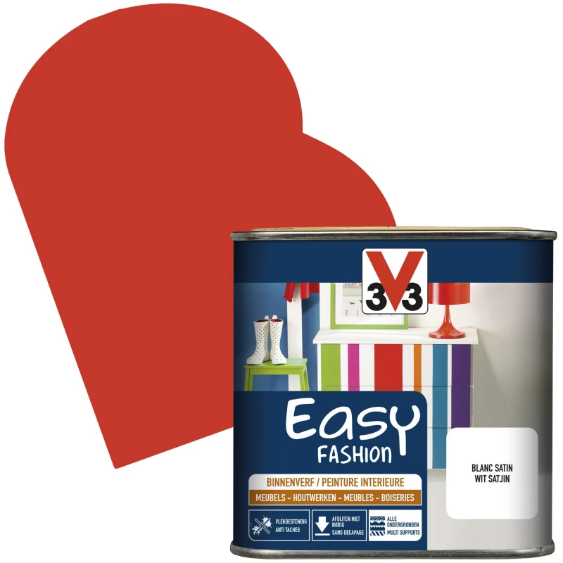 Si vous cherchez une solution efficace pour donner une nouvelle jeunesse à votre intérieur, la peinture Easy Fashion de la marque V33 convient idéalement. Ce produit vous permet d’appliquer une jolie couleur rouge lipstick à la finition satinée afin de rénover vos meubles, neufs ou anciens. Applicable sur tous types de supports, cet élément vous offre une résistance optimale et durable face à l’eau, les taches ou les chocs. Vous pouvez utiliser ce produit sans décapage du support au préalable.