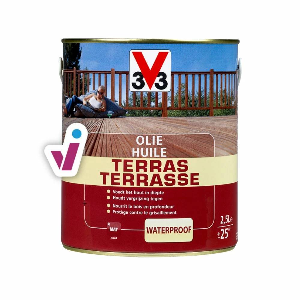 De V33 Terras Olie is speciaal ontwikkeld voor gebruik buiten, op houten vloeren en tegels in de tuin of op het terras en is geschikt voor exotische houtsoorten (Bangkirai,Teak, Ipé, Padoek,…) of grenen.