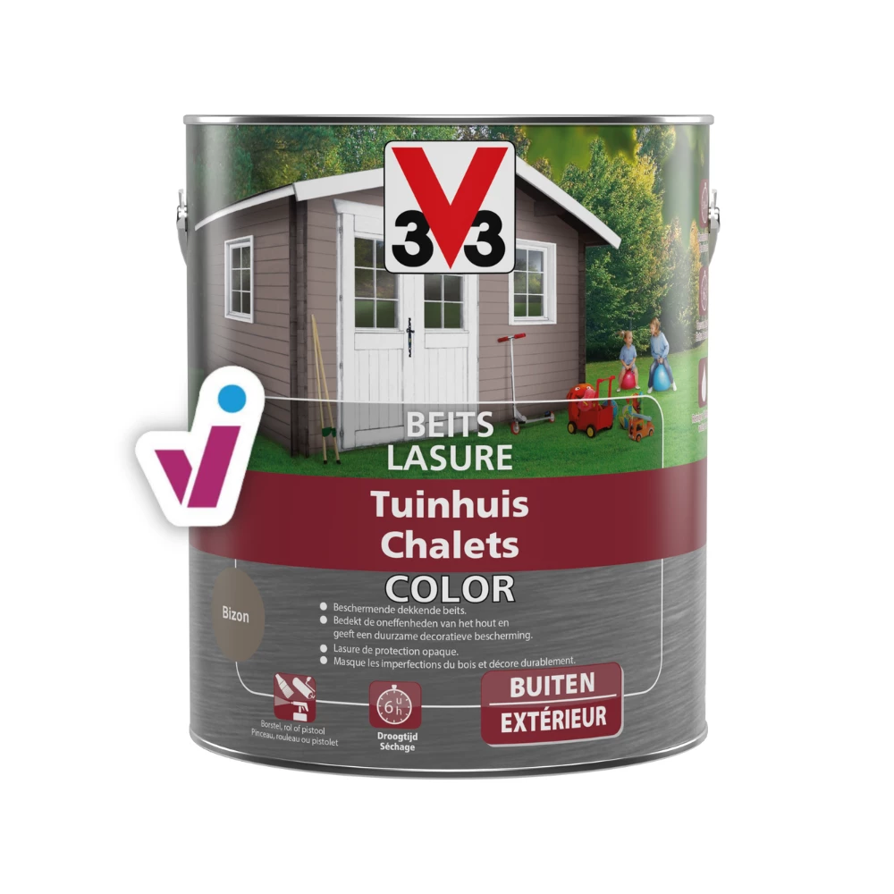 V33 Beits Tuinhuis Color is een dekkende beits bestemd voor het beschermen van tuinhuizen of andere grote houtoppervlakken buiten. Het bedekt de oneffenheden van het hout en geeft een duurzame decoratieve bescherming. De beits is geschikt voor alle houtsoorten.